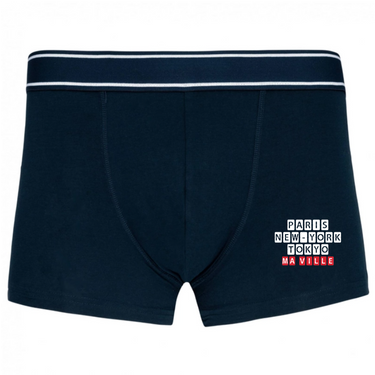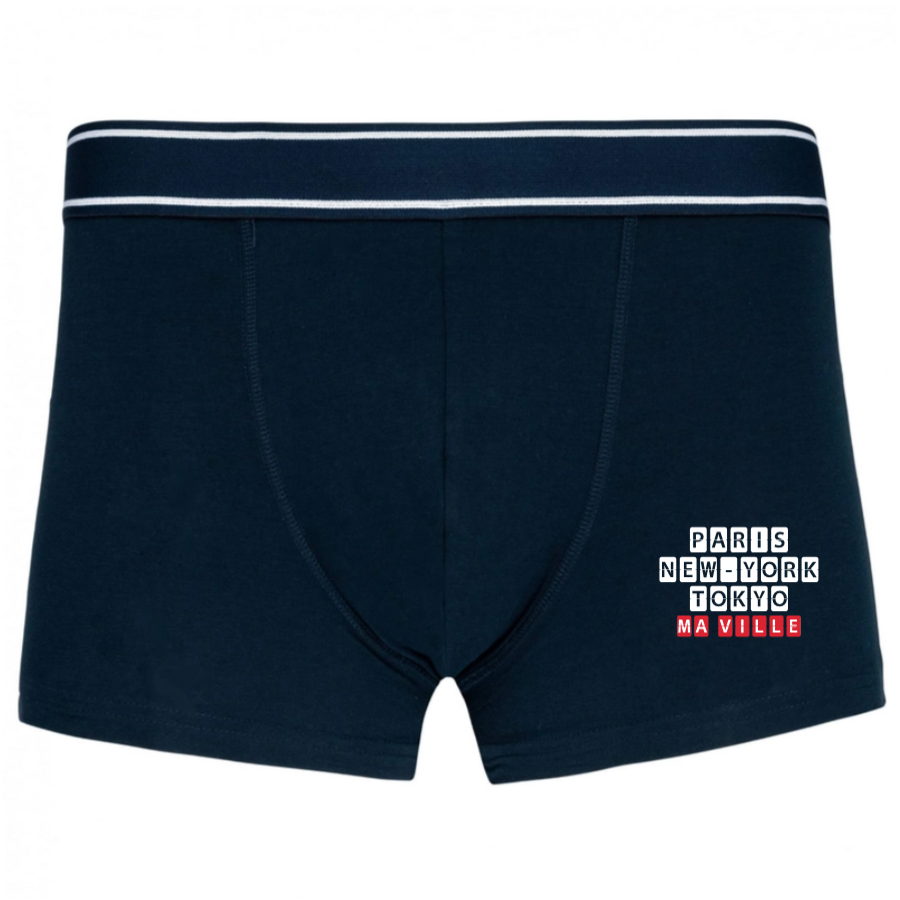 Discover our men's boxer shorts, designed to offer optimal comfort throughout the day. These boxer shorts combine support, style, and durability. With their blended cut, they fit all body types perfectly while offering great freedom of movement. Customizable with the name of your city, they become a unique piece that accompanies you in your everyday life.